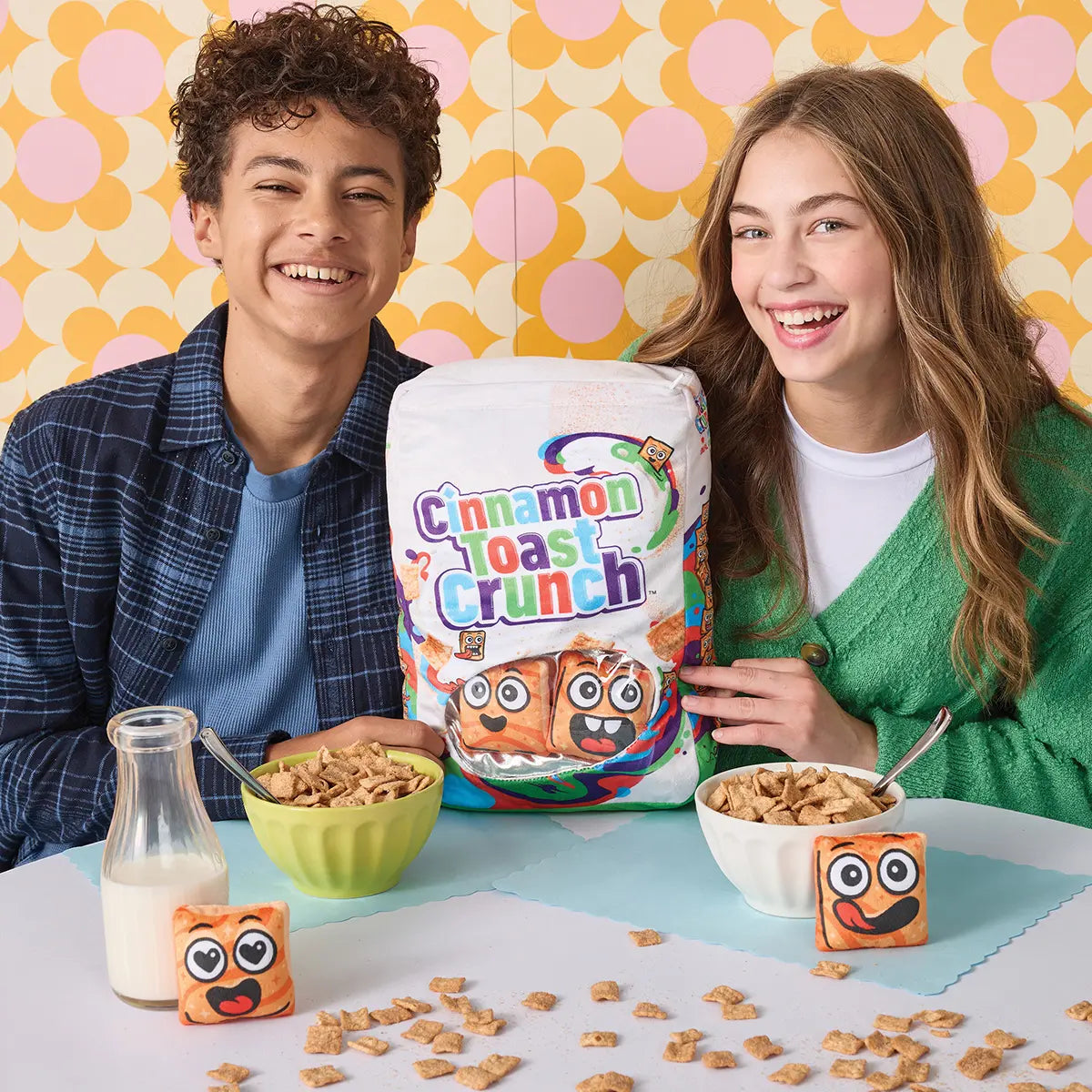 This adorable fleece plush is a replica of Cinnamon Toast Crunch cereal packaging and includes 4 removable pieces of cereal!