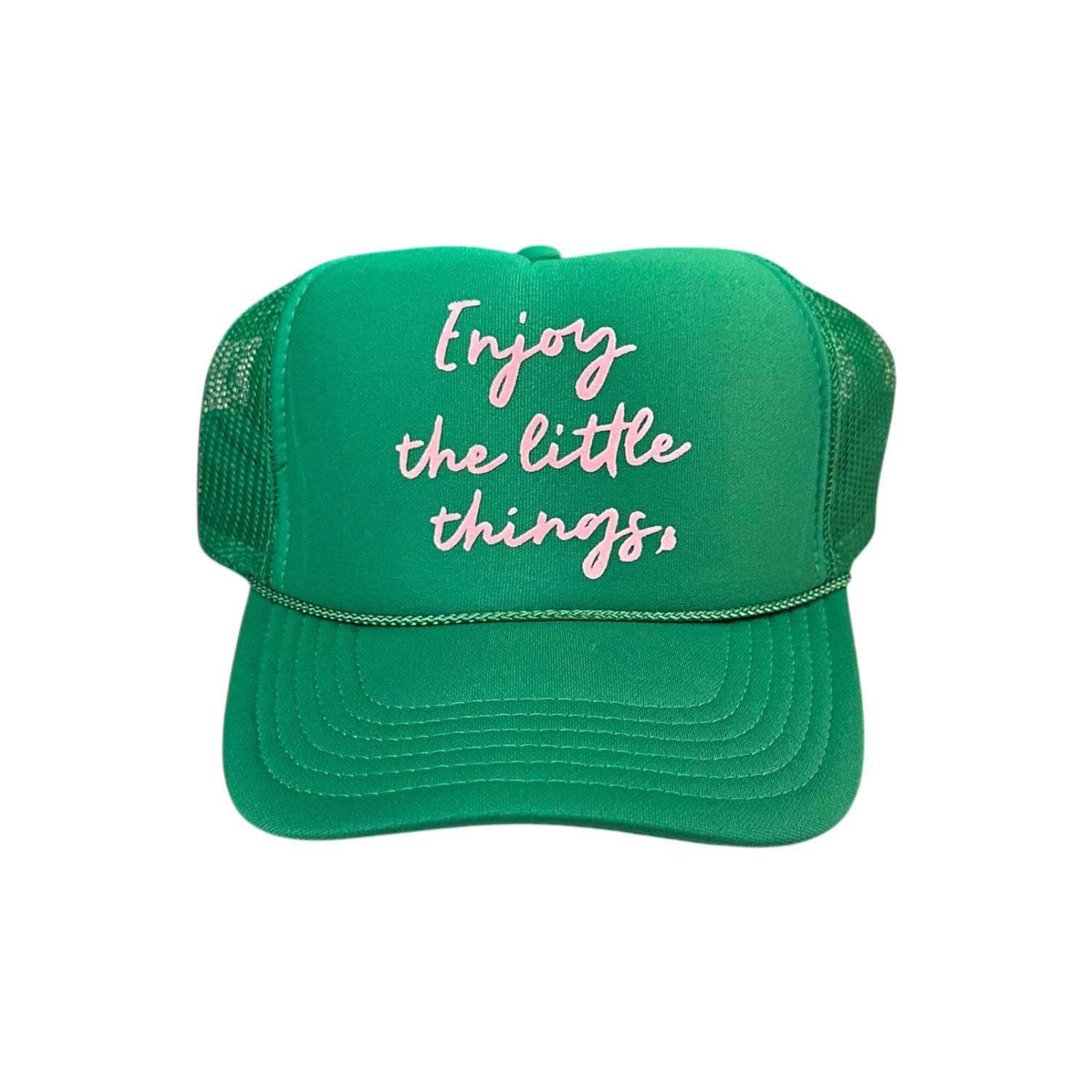 Enjoy the little things in light pink velvet on green trucker hat! This trucker hat is a unisex fit. The design is not a patch - It is a 2D velvet vinyl design. The hat itself is a foam front with a mesh back snapback. Comfortable fit. Perfect solution for a messy hair day!