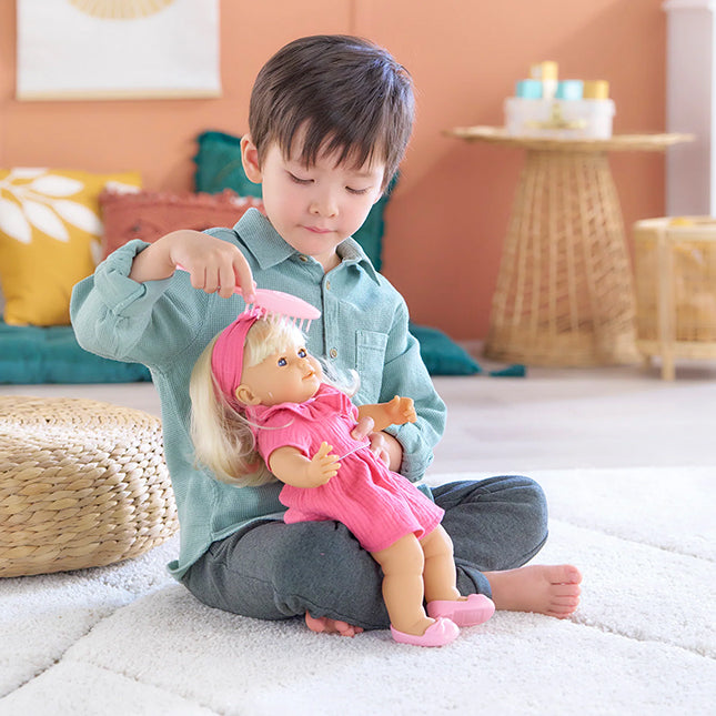 Jade is a soft-bodied, 14-inch tall mon grand poupon Corolle baby doll for little ones wanting a baby of their own to love. With her long easy-to-style hair, children ages 3 and up are introduced to hairstyling play (hairbrush included). Jade's blue sleepy eyes close when she is put down for a nap or at bedime, and her face, arms and legs are made of soft, supple vinyl that is lightly scented with vanilla, a Corolle signature. She is dressed in a pretty pink dress and wears a color-coordinated headband and removable pink shoes.