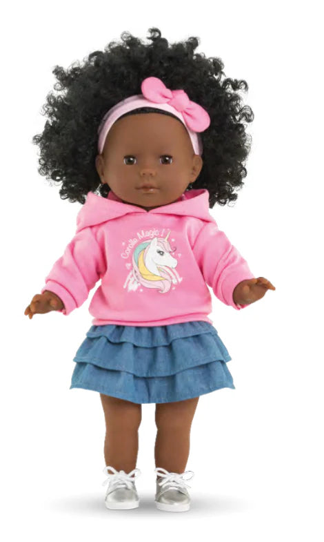 Maelys is a 14” doll, perfectly sized to be cradled in a young child's arms and is ideal for hugging and cuddling. Her soft body allows it to take on the same positions as a real baby, and its brown sleepy eyes close.