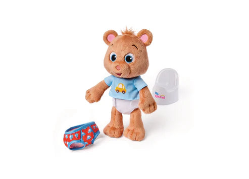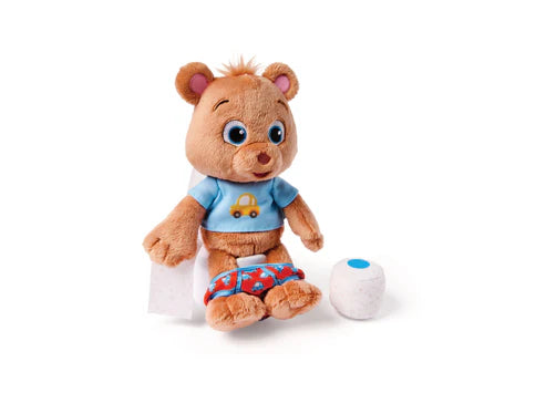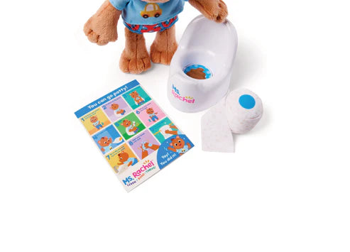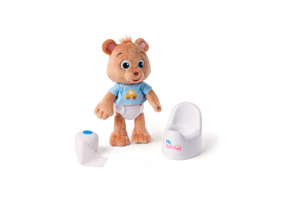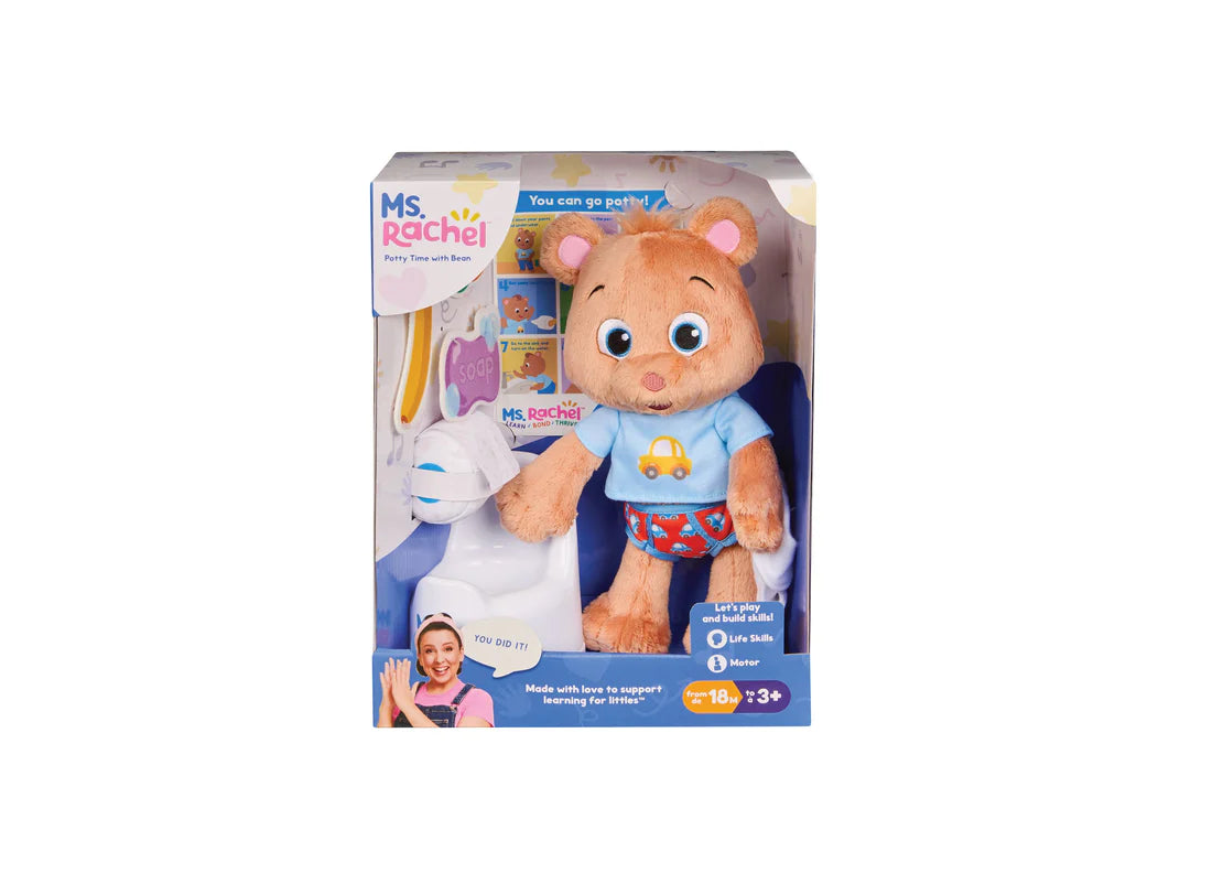 Make potty training fun, approachable, and interactive with the Ms. Rachel Potty Time with Bean set! Join Ms. Rachel's friend Bean, an adorable teddy bear plush, as he learns potty skills using his own play toilet with reversible flap for #1 and #2. The set includes play toilet paper, a detachable diaper, and felt accessories like a banana, sippy cup, and soap to encourage fine motor skill development.