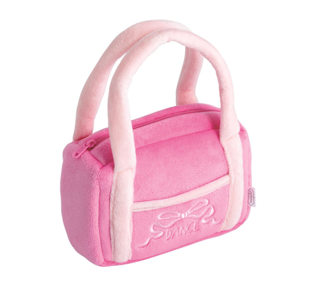 7-piece set. Plush ballet bag holds plush ballerina doll, flower bouquet, mirror, white and mesh tutus and stretchy crown for the child to wear. Ages 3+
