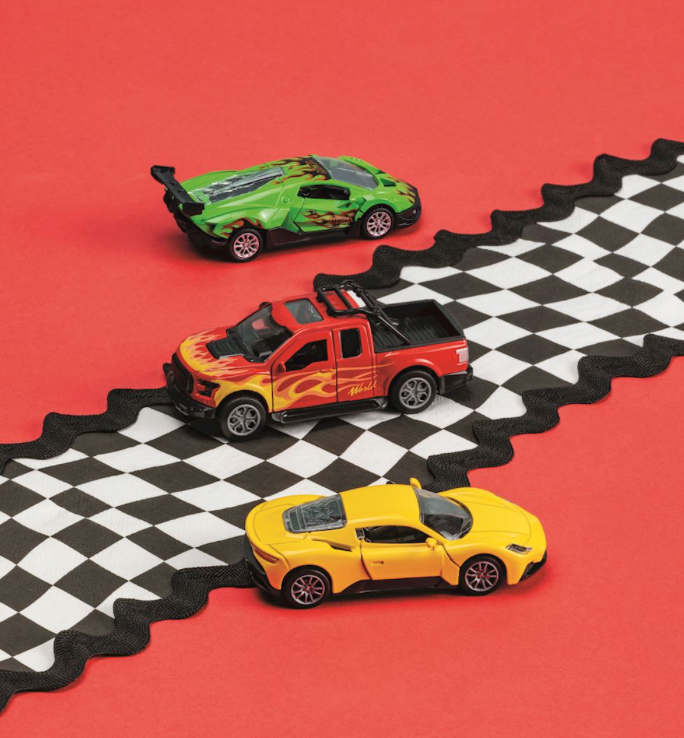 Metal pull-back car with lights and sound. Battery included. Ages 3+.