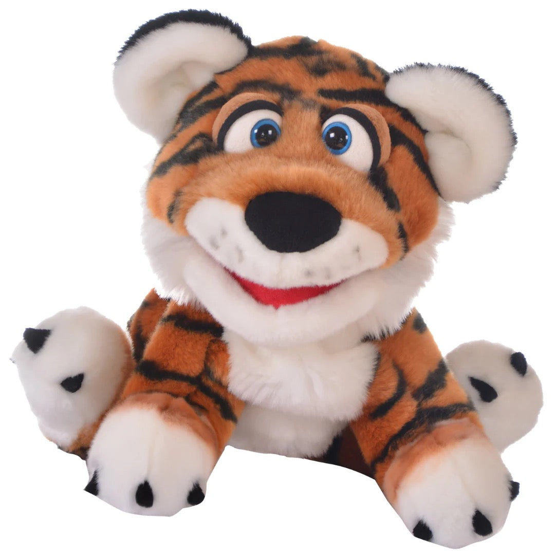 Thin Air Puppets' Rollo is a popular, soft, orange-and-black tiger cub hand puppet (around 14-16") known for its movable mouth and head, encouraging imaginative play, storytelling, and speech development in kids, trusted by parents and educators for its quality, craftsmanship and safety.