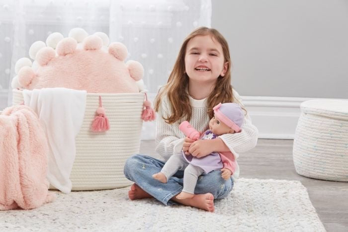 Our Sweet Smiles Puppy is an adorable 14” doll that is just the right size for your child to snuggle. Along with its soft body, its weighted bottom and molded head, legs, and arms make it feel so real to your child. Its gently smiling face comes with super sleepy eyes, making it the perfect doll for bedtime play. Our puppy comes dressed in an adorable lavender puppy dress along with polka dot leggings and a matching cap. Our doll wipes clean with a damp cloth and is shipped in a window box to get your child excited as soon as they see it. It also comes with a bottle which encourages your child to engage in nurturing, imaginative play that teaches kindness and empathy. This doll is recommended for 12 months and up and will be the perfect companion for your child to grow with.